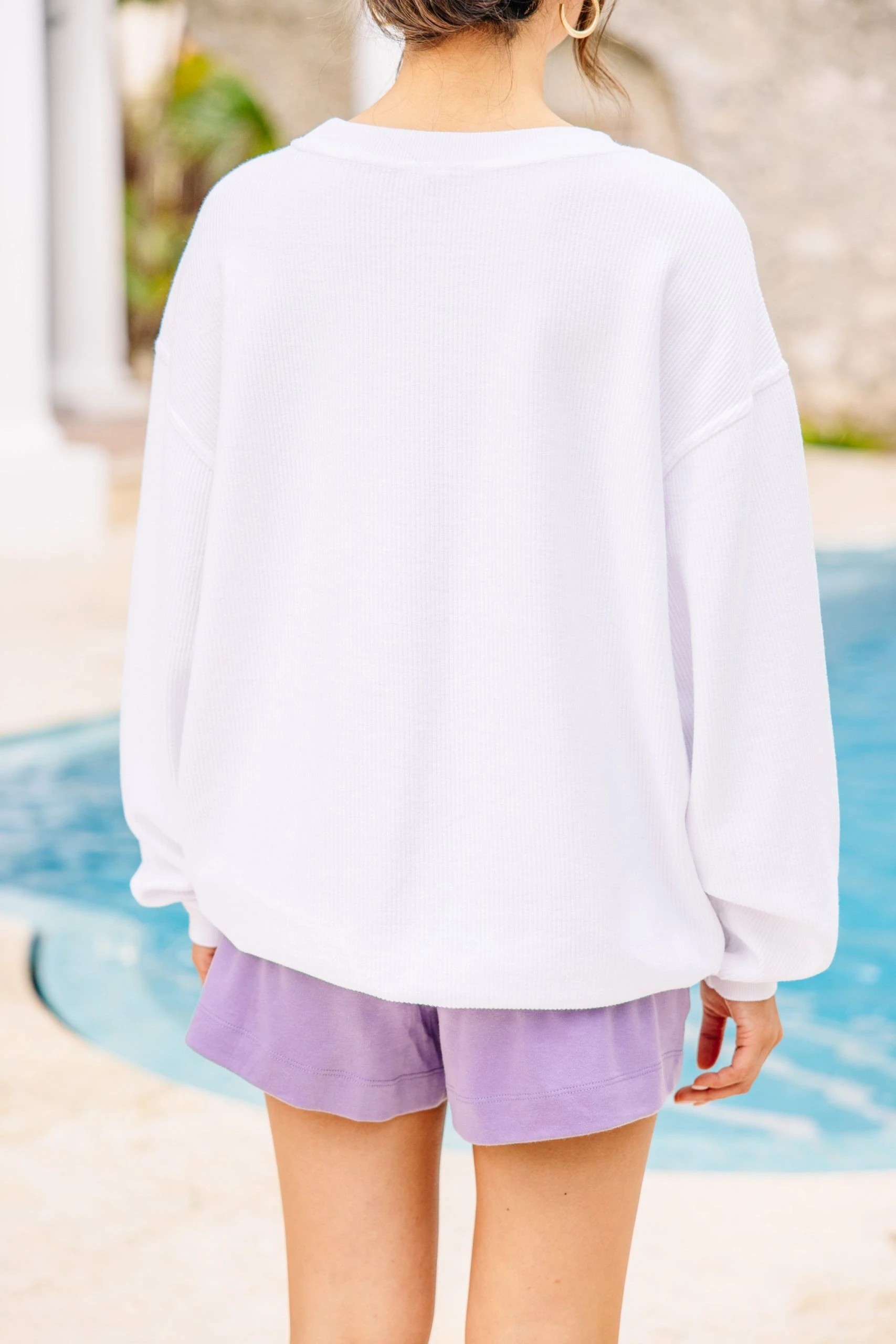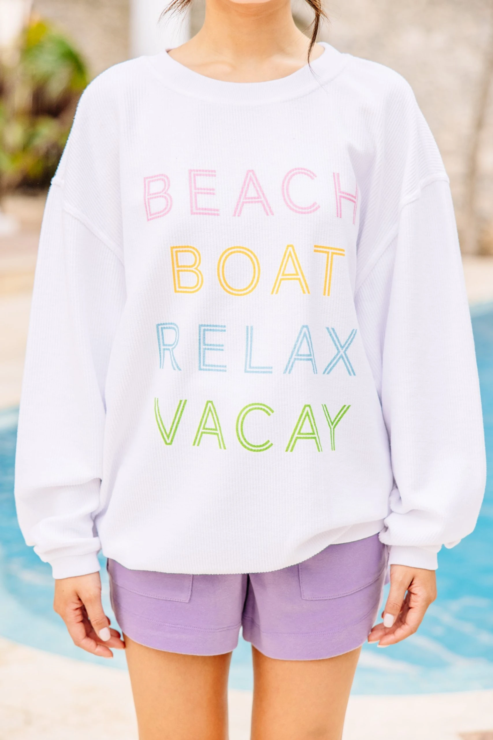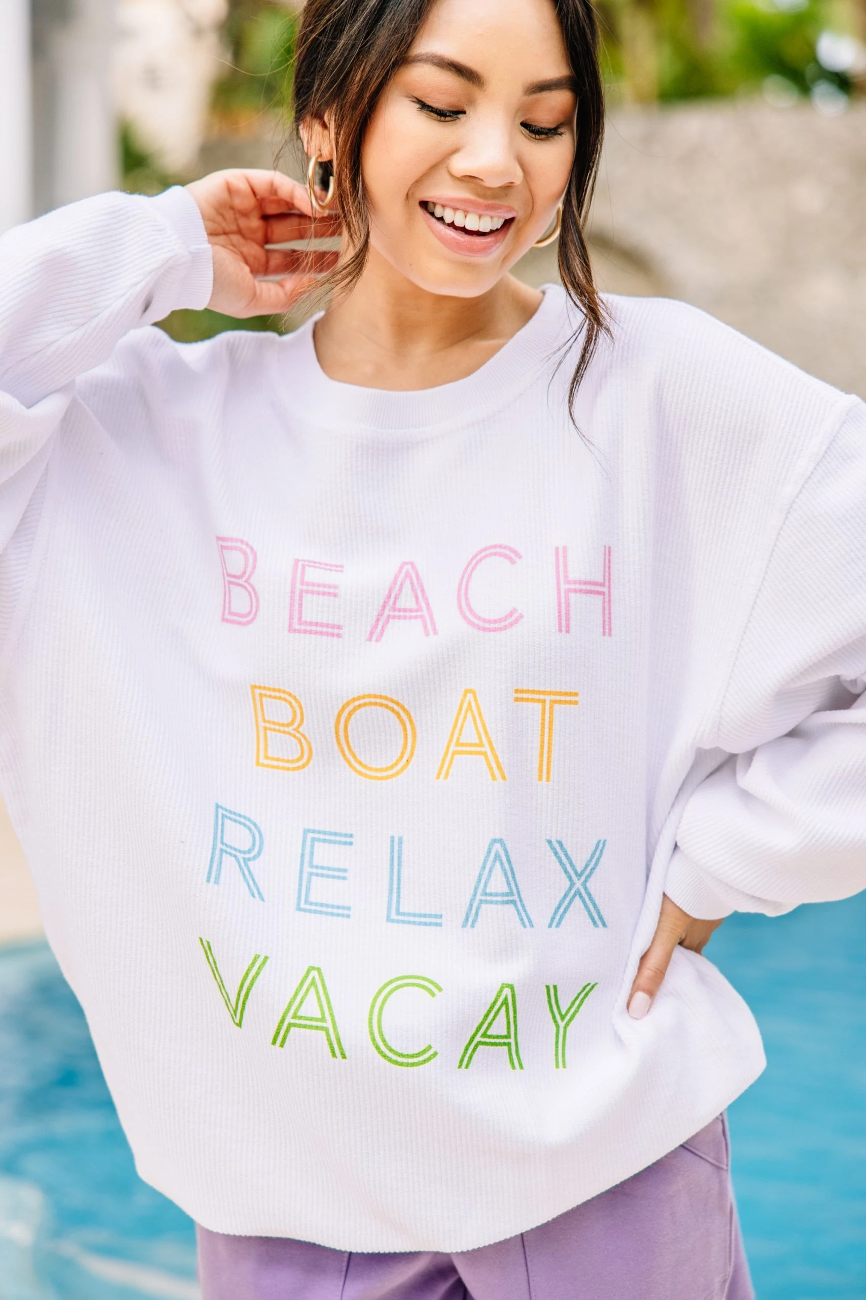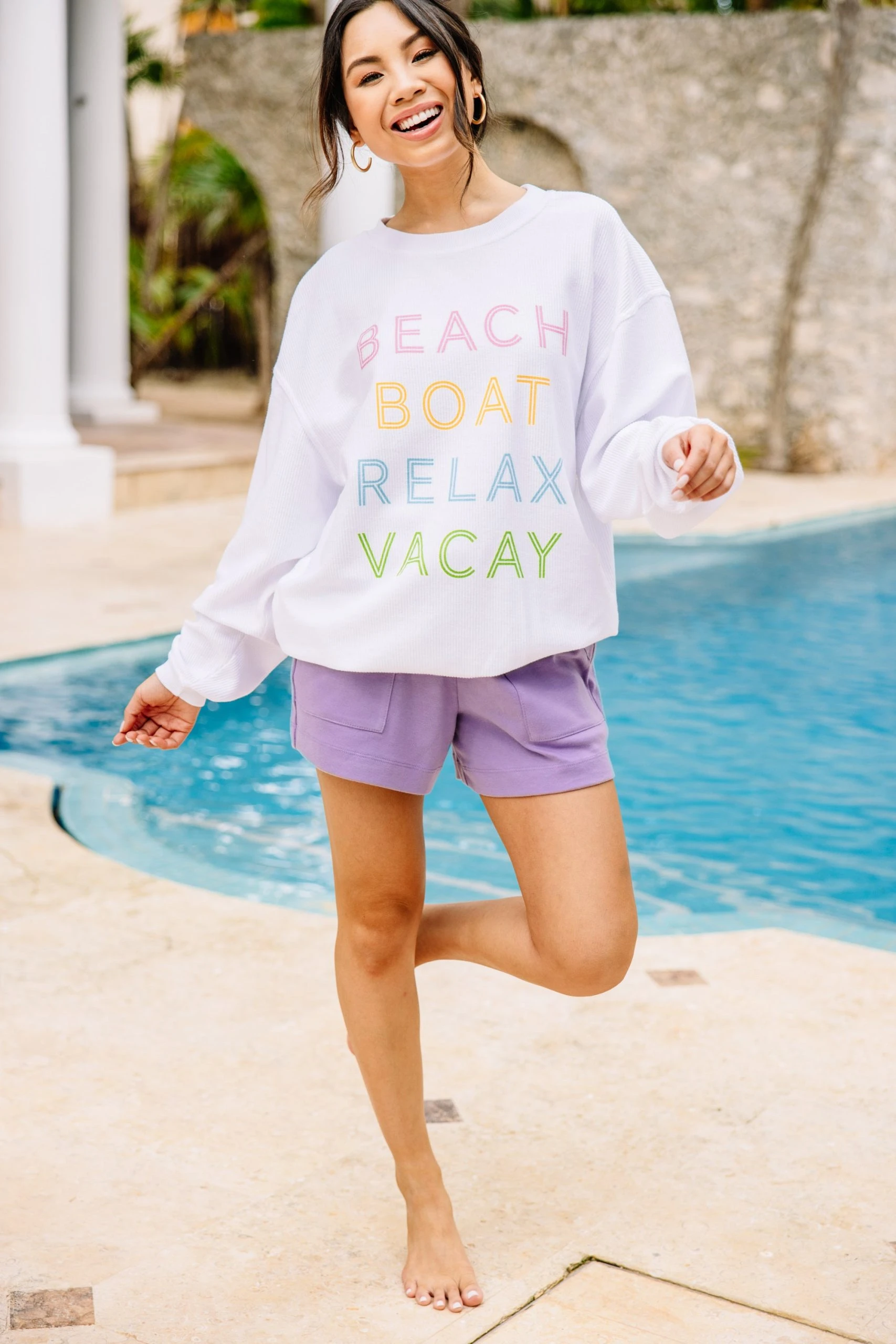This graphic sweatshirt is just what want this summer! We want to beach, boat, relax, and vacay! We also really love the soft colorful words on this white sweatshirt! This cutie is going to look great with your favorite shorts this summer! This sweatshirt features long sleeves, a crew neckline, textured ribbed/corded fabric, and a fun summer graphic.