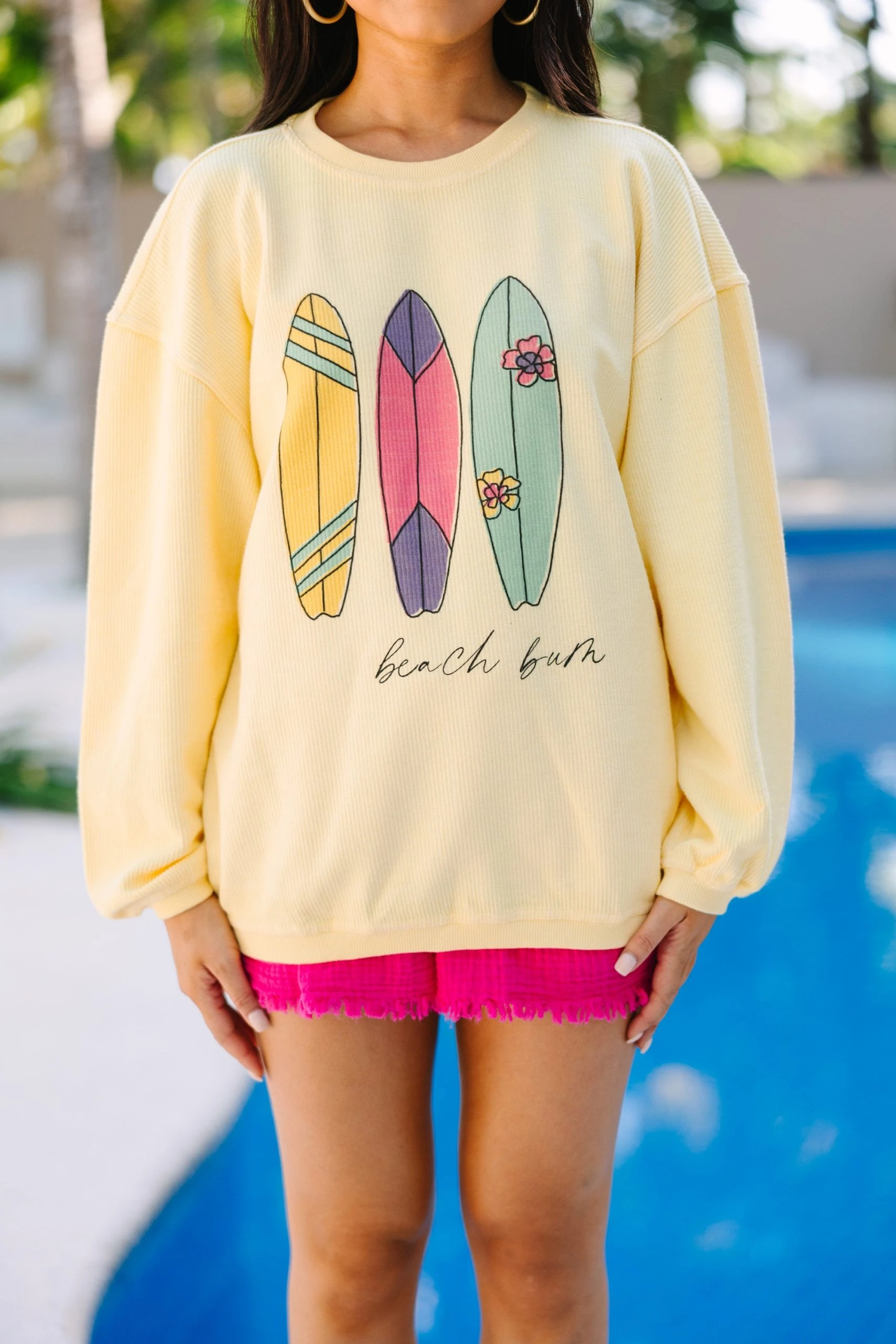 Calling all beach bums! This graphic sweatshirt is for you! Those colors are so fun together and we love the generous fit! This tee is going to look so cute with jeans, shorts, or even over a swimmy! This sweatshirt features a crew neckline, long sleeves, corded fabric, and a fun graphic.