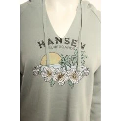 The Hansen Womens Sweatshirt Risin Sun Crossover Neck is a 52% Cotton 48% Polyester fleece hoody with front screen print and print on left sleeve.