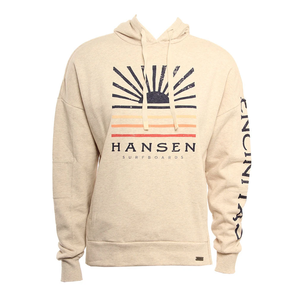 The Hansen Womens Sweatshirt Risin Sun Hoodie is a 65% Cotton 35% Polyester fleece with front screen print and print on left arm.