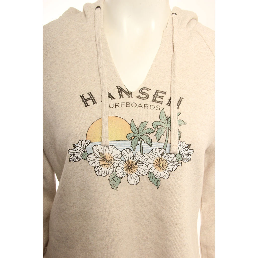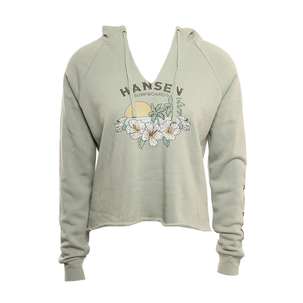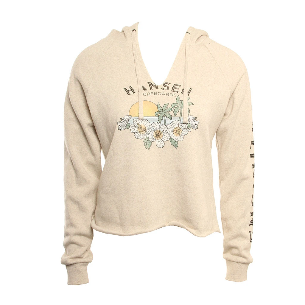 The Hansen Womens Sweatshirt Rom Com Crop Hood is a 50% Polyester 38% Cotton 12% Rayon fleece with front screen print and print on left sleeve.