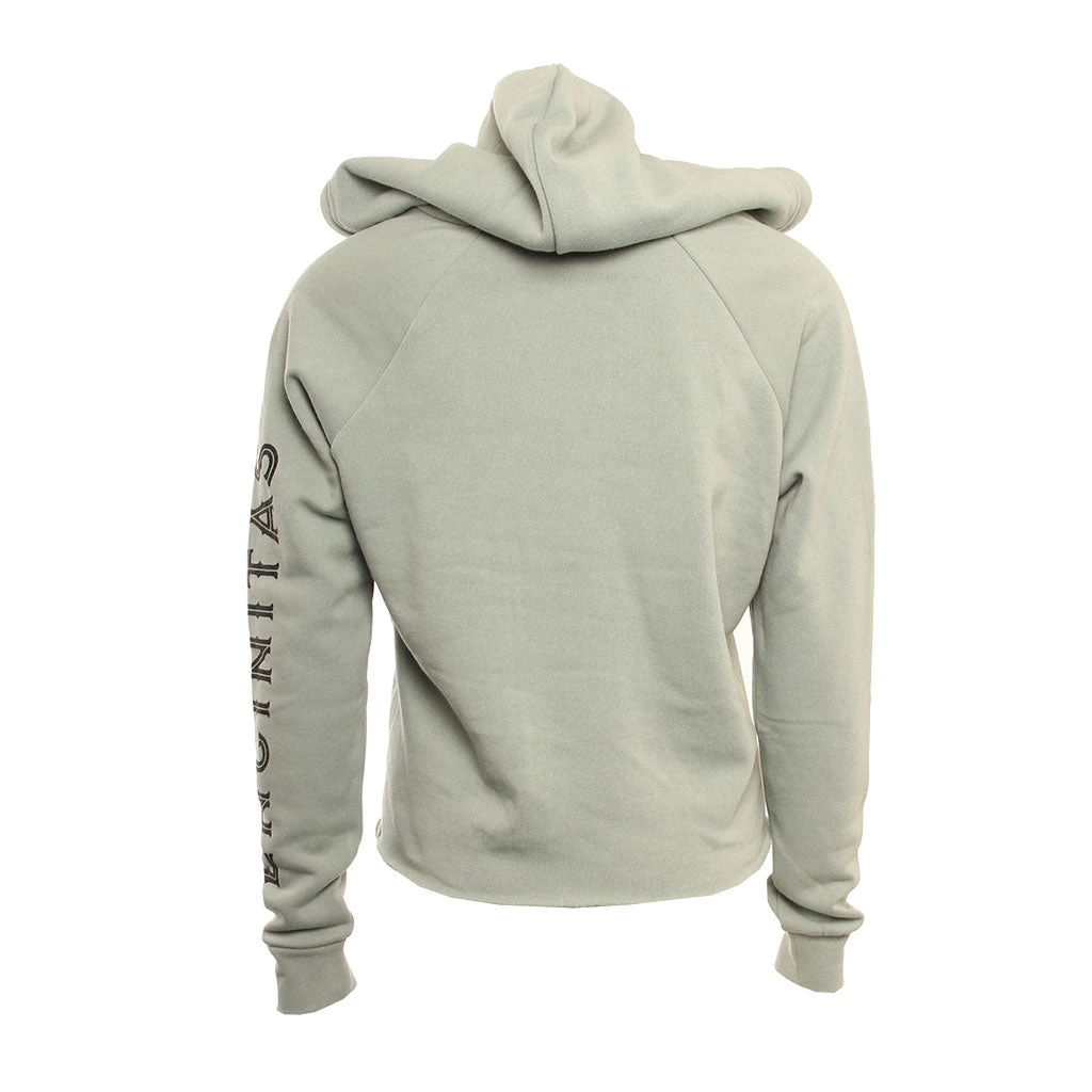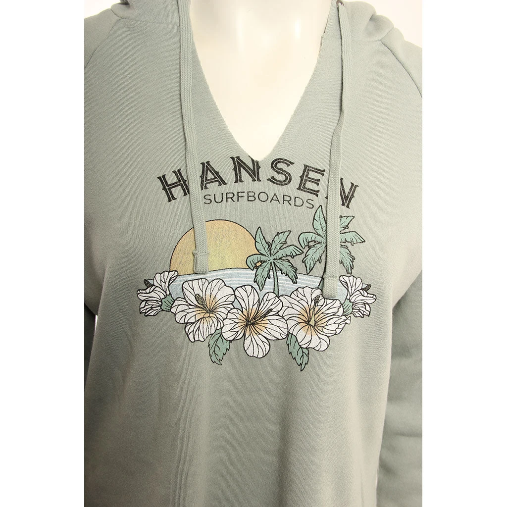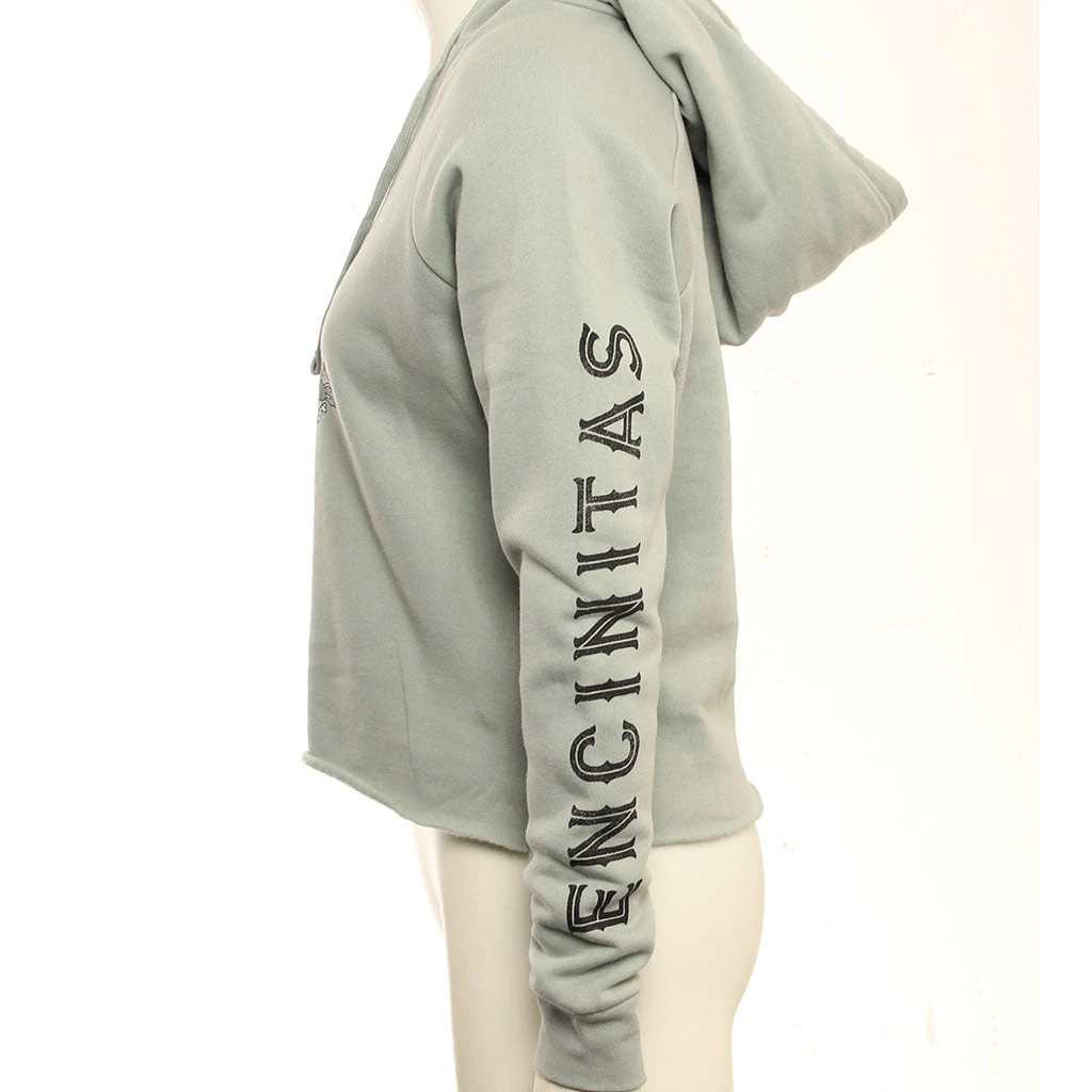 The Hansen Womens Sweatshirt Rom Com Crop Hood is a 50% Polyester 38% Cotton 12% Rayon fleece with front screen print and print on left sleeve.
