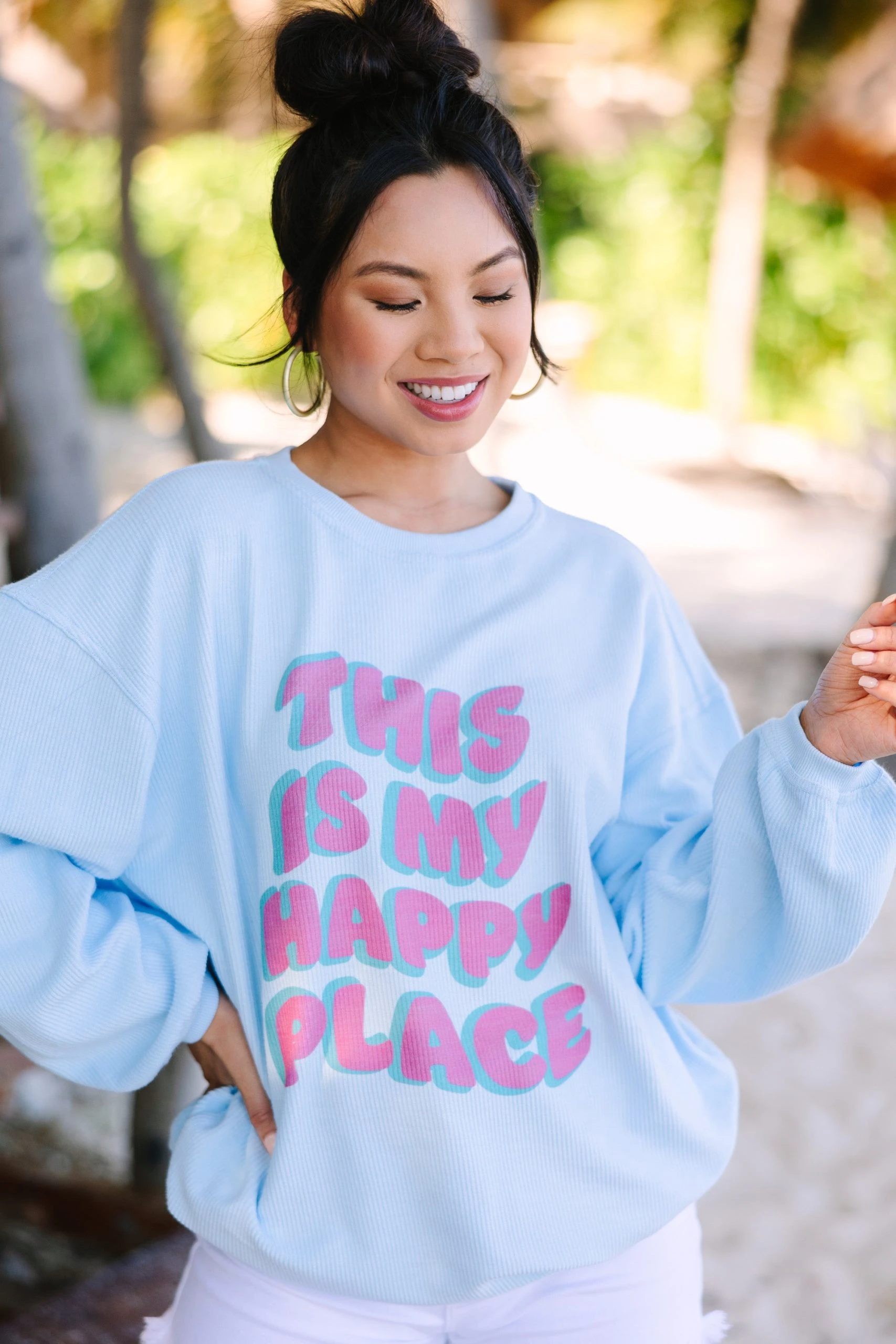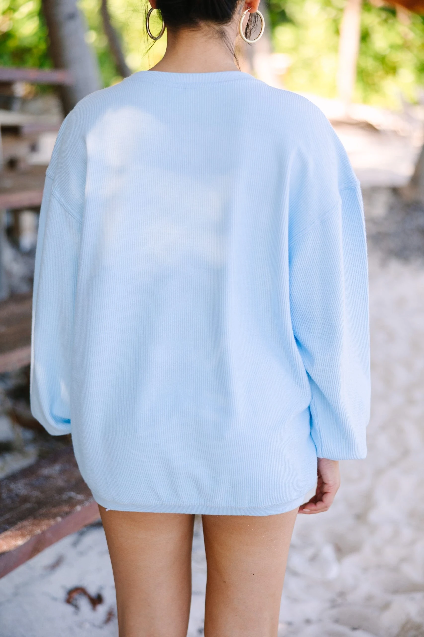 You are going to want to take this sweatshirt to your happy place every time! It’s so cute and we love those colors! This sweatshirt is going to look great with white shorts at the beach or over a swimmy! This sweatshirt features long sleeves, a crew neckline, corded fabric, and a cute summery graphic.