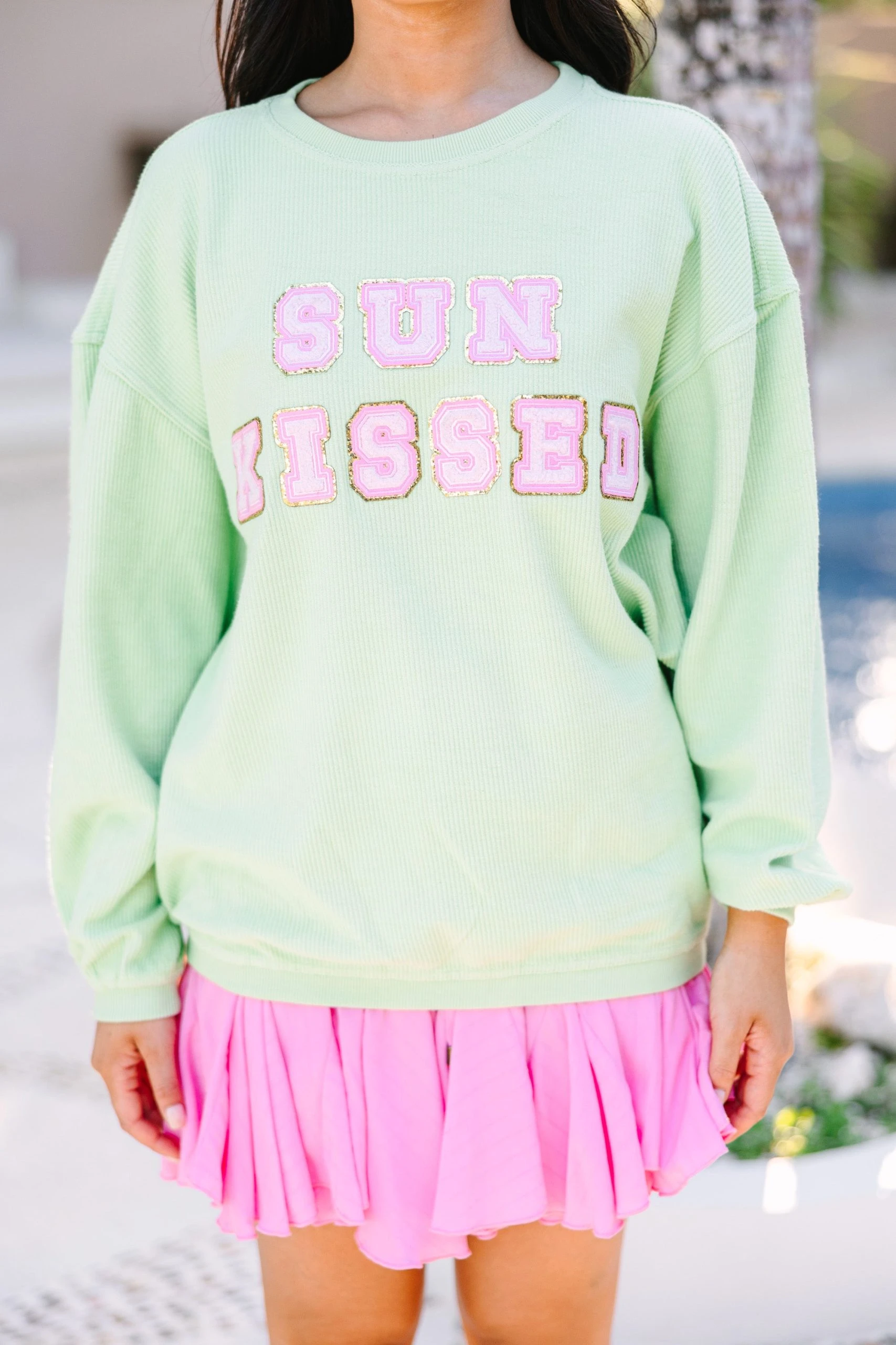 We just can’t wait for the sun to come out and get that little sun kissed glow! And when that bright, beautiful sun goes down at the end of long day, this is the perfect sweatshirt to throw on with your jean shorts or with some comfy lounge shorts! This sweatshirt features long sleeves, a crew neckline, corded fabric, and cute varsity lettering.Â