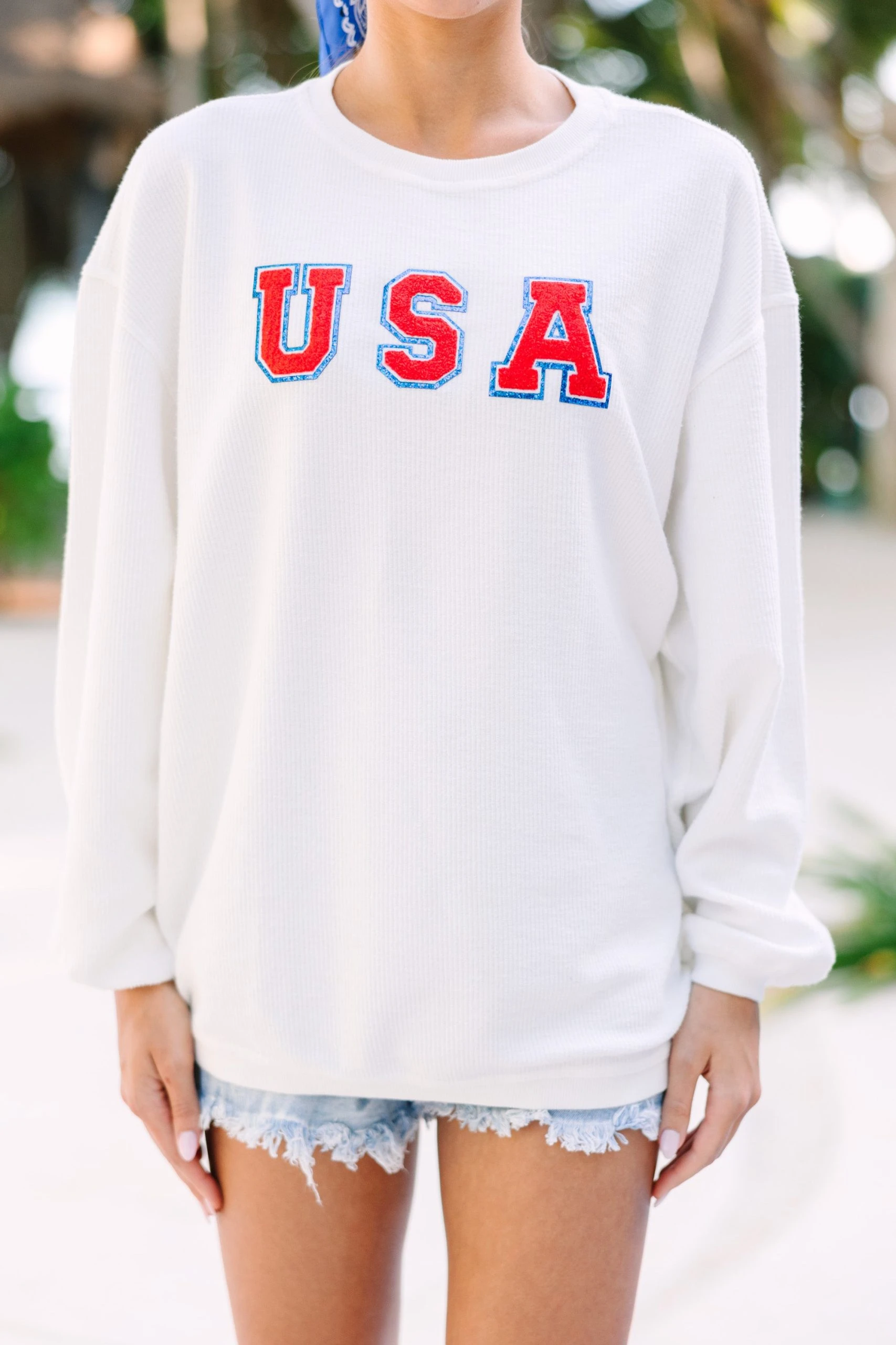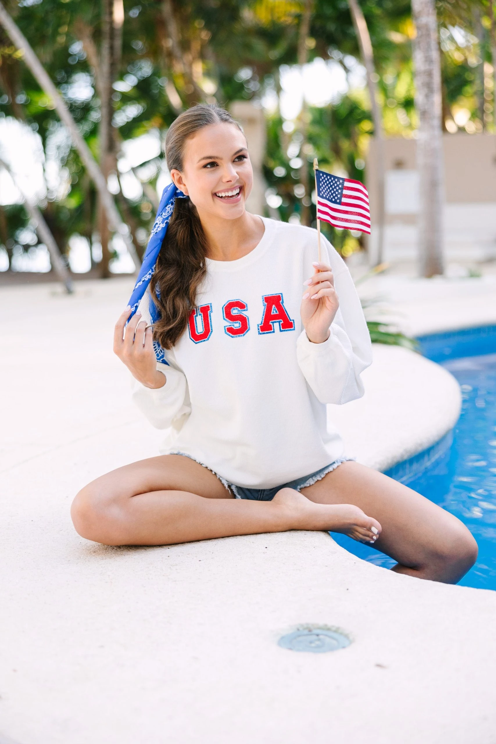 This sweatshirt is the definition of patriotic! We are loving the colors and classic look of this cozy cutie! Those varsity letter are super cute too! The textured detailing and blue glittery outline are the perfect combo! This sweatshirt is so patriotic and cute! This sweatshirt features long sleeves, a crew neckline, corded fabric, and festive varsity patchwork.Â