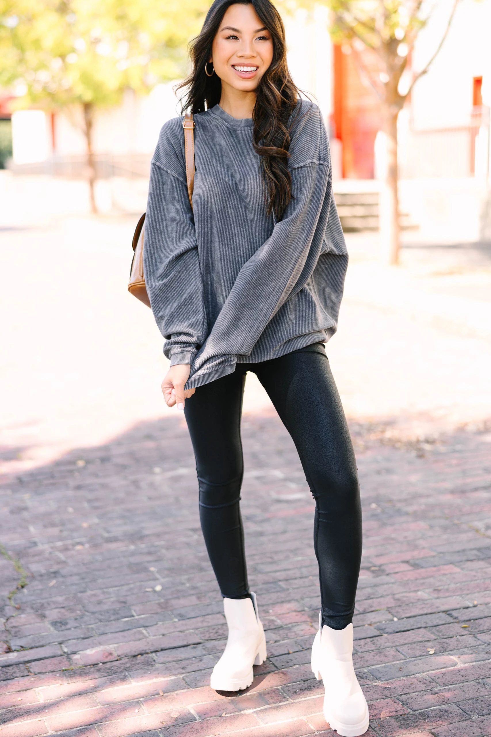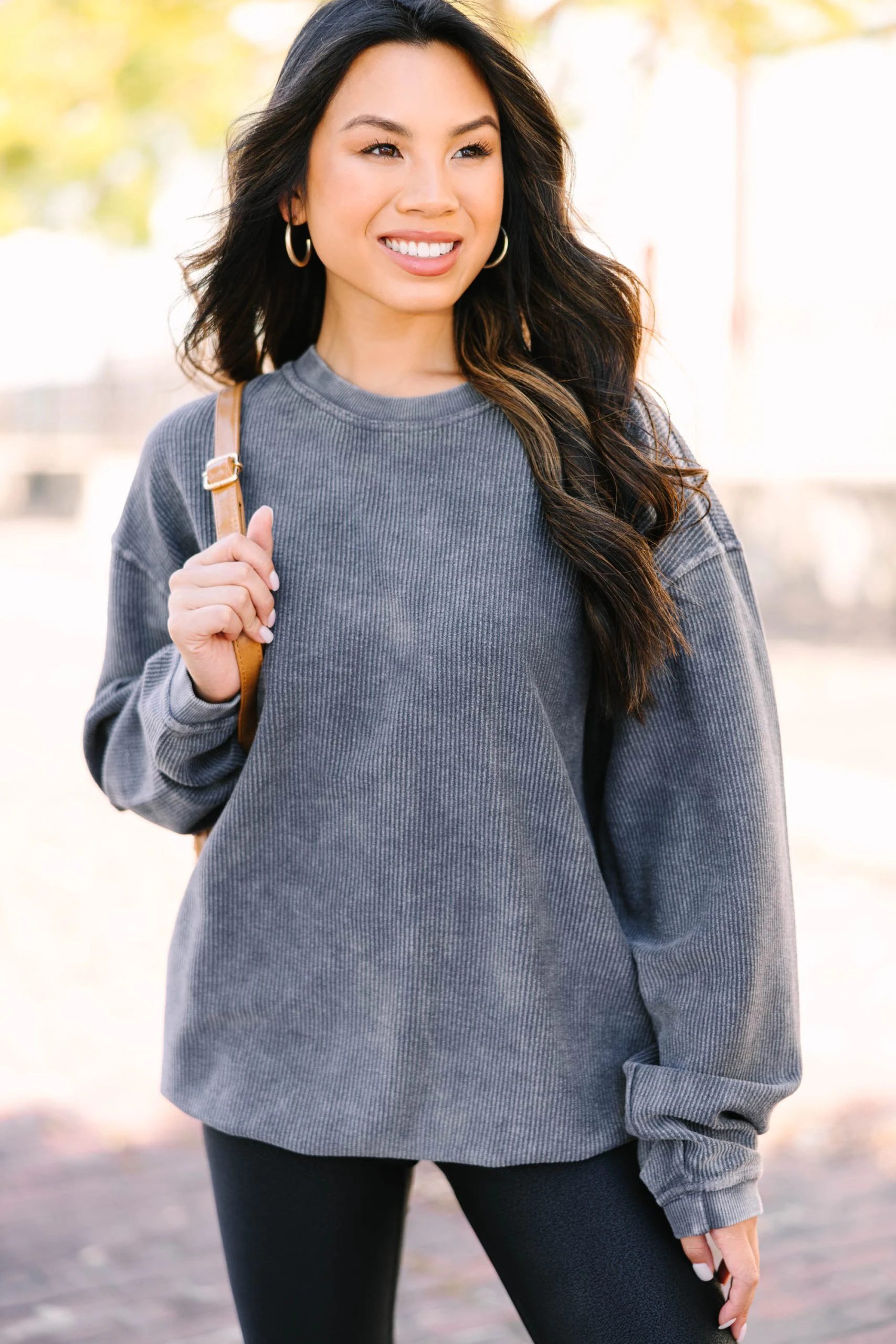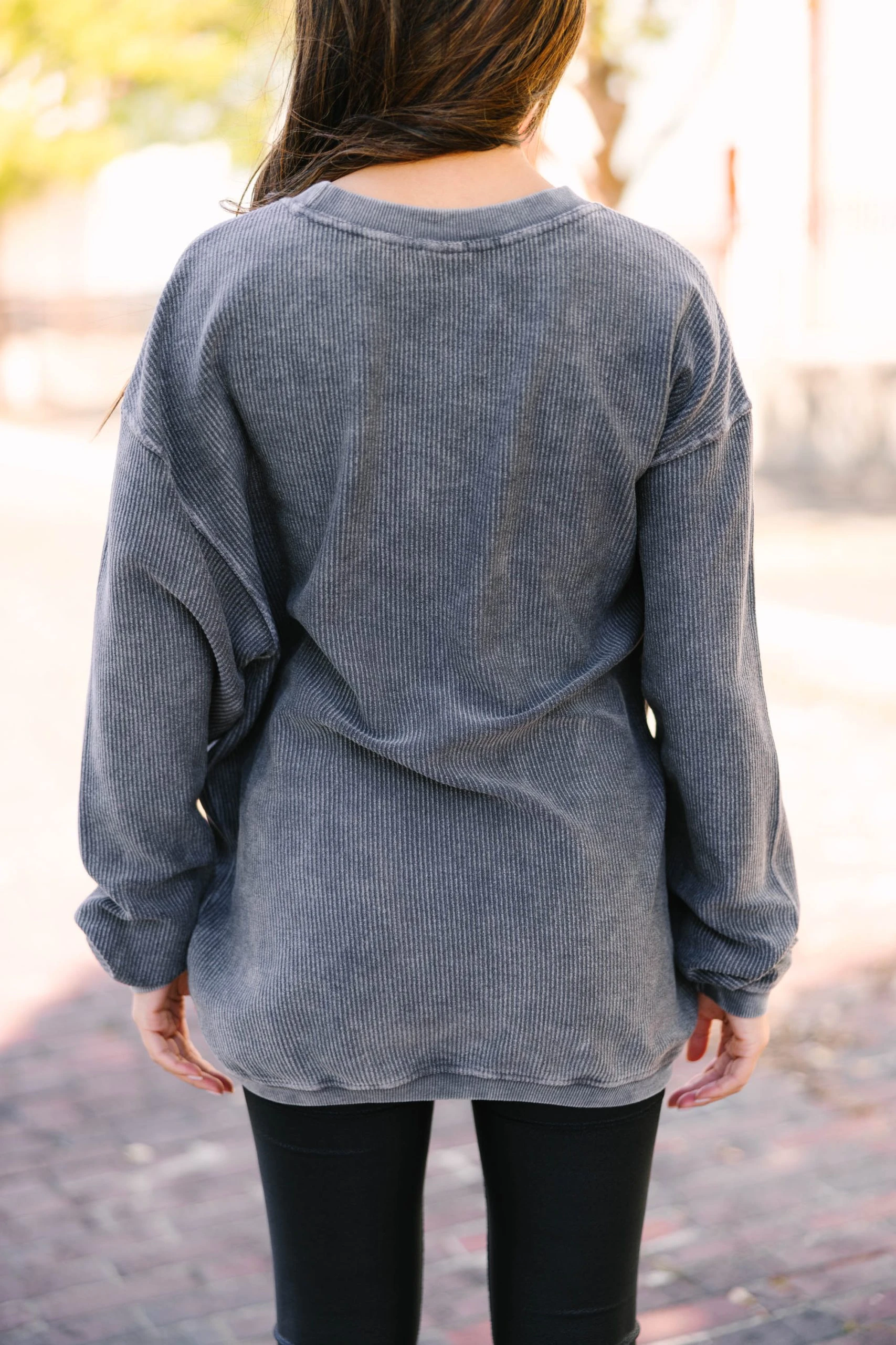 This corded sweatshirt is the epitome of casual comfort! The ribbed knit fabric is super soft and cozy not to mention right on trend! This sweatshirt is going to look fab with all sorts of different biker shorts, jeans, and leggings! This sweatshirt features a crew neckline, long sleeves, and a corded/ribbed fabric.